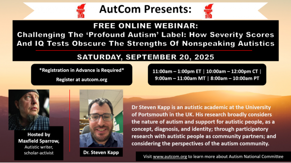 AutCom Board Member Maxfield Sparrow will introduce our presenter, Dr. Steven Kapp. At the end of his presentation, Dr. Kapp will respond to attendee questions in a Q&A session.